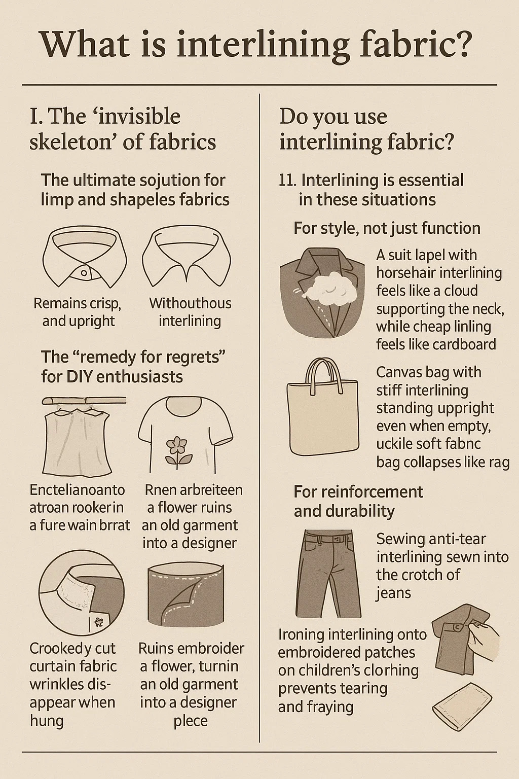 Idagdag Interlining sa isang manipis na kwelyo ng shirt, at mananatili itong malulutong at patayo kahit na matapos ang dalawampung paghugas, hindi katulad ng mga walang pag -uugnay na mabilis na maging malabo.