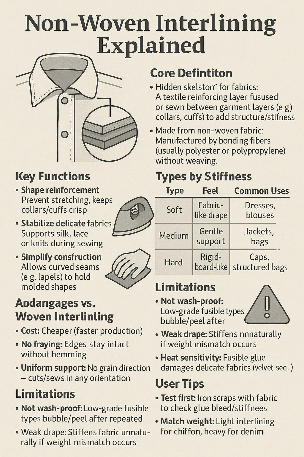 "Nakatagong Skeleton" para sa mga tela: isang tela na nagpapatibay ng layer na fused o sewn sa pagitan ng mga layer ng damit (hal., Mga collars, cuffs) upang magdagdag ng istraktura/higpit.